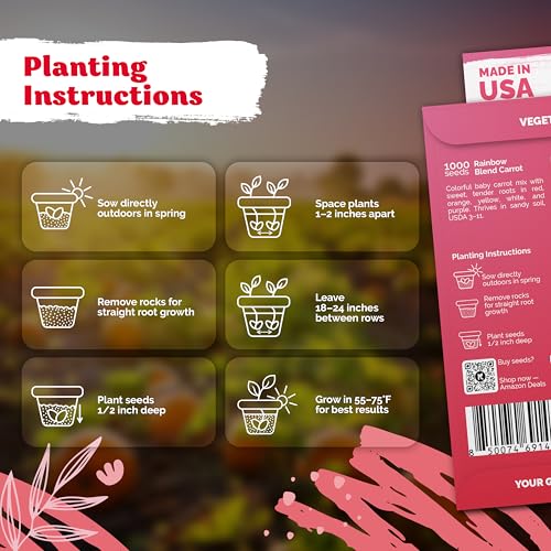 Vibrant Colors: Red, purple, white, yellow & orange rainbow carrots; 90%+ germination rate. Rainbow carrot seeds for planting thrive in USDA 3‑11, ideal for growing organic carrots fresh for juicing & fresh snacks.