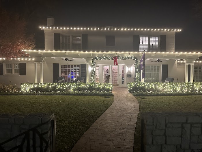 NOTE: I downloaded four photographs of our 2023 lights. The fourth one has been processed through the Prisma App’s Femme filter, with the result of moonlight coming through the live oak tree above making the roof appear illuminated.