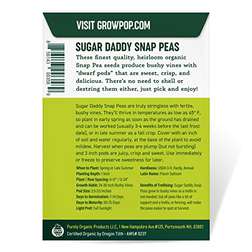 Pisum Sativum: These finest quality, non-GMO, USDA Organic Snap Pea seeds produce bushy vines with “dwarf pods” that are sweet, crisp, and delicious. There’s no need to shell or destring them either, just pick and enjoy!
