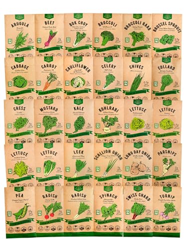 Gardening Kit: 30 Winter Vegetable Garden Seeds Variety Pack NON GMO Heirloom Seeds LESS THAN $0.9 PER SEED VARIETY PACK 33,200+ seeds including: Arugula, Beet Detroit Dark Red, Bok Choy, Broccoli, Rapini, Brussel Sprouts, Cabbage, Carrot Imperator 58, Cauliflower, Celery, Chives, Collards, Cress, Mustard, Kale, Kohlrabi, Buttercrunch, Iceberg, Oakleaf Green, Romaine, Leek, Tokyo Long White Scallion, Walla Walla, Parsnip, Pea, Cherry Belle, Daikon White Stem, Spinach, Swiss Chard, Turnip.