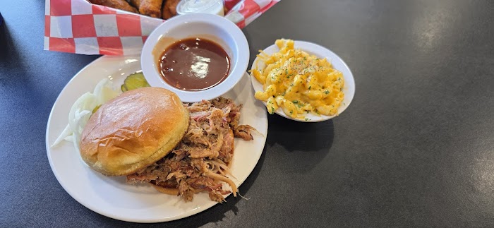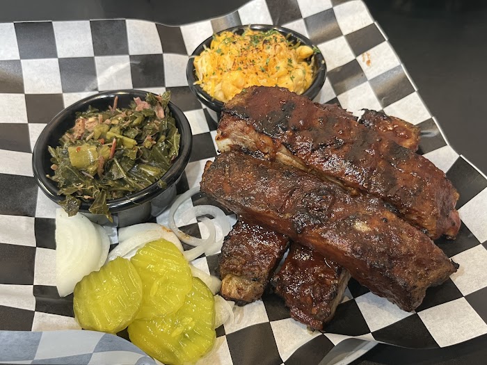 The food was seriously amazing. It was a little more expensive but it was totally worth the price for the quality of the BBQ. I got the cowboy burger which was incredible, stacked with bacon, tender brisket, and cheese. It was so good and I left super full. The mac and cheese was delicious. My friend loved the collard greens a lot and she also really liked the jerk chicken. The garlic parmesan fries were super good too. My husband got the huge dino rib; it was honestly the biggest rib I have ever seen and it was so juicy and good. The atmosphere is very casual, just a small space with two tables and a TV, but that makes the focus entirely on the food. You can tell the owner cares deeply because he came out and talked to us about our experience after the meal. Go here for some truly fantastic, passionate BBQ.