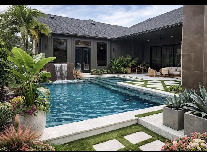 The idea of constructing a pool is daunting. Designing? Even more so. Sunset transformed the entire experience into something exciting and surprisingly seamless. Our project involved converting a large covered patio and a quarter-acre yard into a beautifully designed outdoor space featuring a generously sized pool with spa, ledges, water feature, and cabo shelf, multiple entertaining areas, kitchen cabana, a fire pit, and timeless material selections while maintaining an organic aesthetic and ensuring the view from within the home was complemented and enhanced.