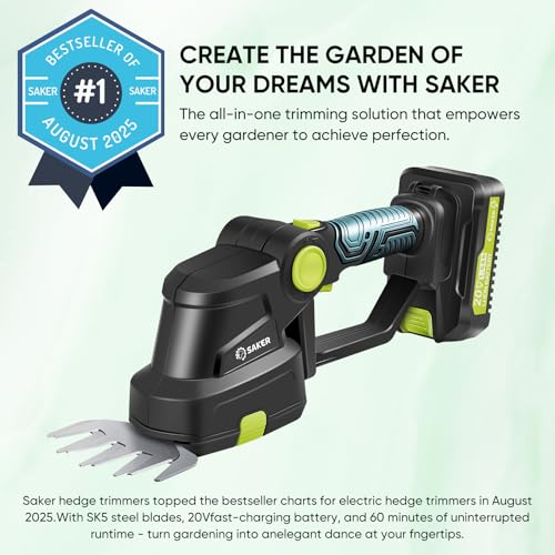 【PORTABLE, CORDLESS & DURABLE】Saker hedge trimmers cordless with battery have easy use and maneuverability for extended periods, can be easily operated by single hand. Ergonomic handle provides a comfortable and secure grip. This saker small hedge trimmer cordless with battery is compact and flexible which allows you to carry it easily for any small gardening job. Also, the both SK5 steel blades ensure a sharp and long-lasting cutting edge but please keep it clean after use.